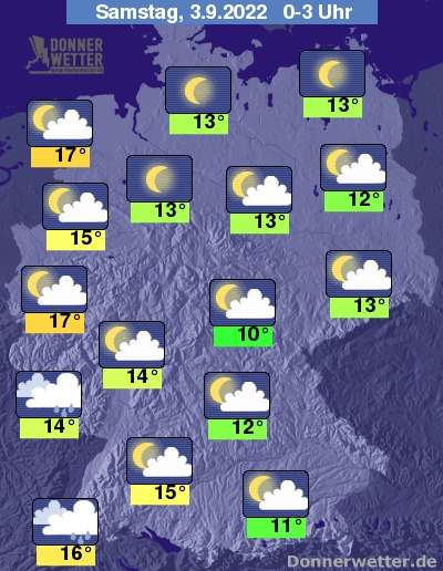 In der Nacht auf Samstag bleibt der Himmel über der Südwesthälfte stark bewölkt und es sind noch einzelne Schauer möglich. In den übrigen Landesteilen überwiegt lockere Bewölkung, im norddeutschen Tiefland ist es auch sternenklar, und es bleibt trocken.