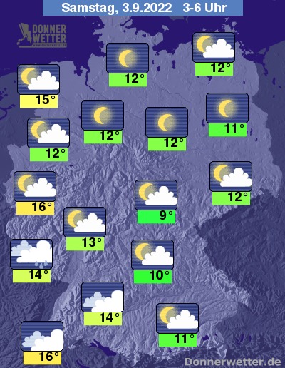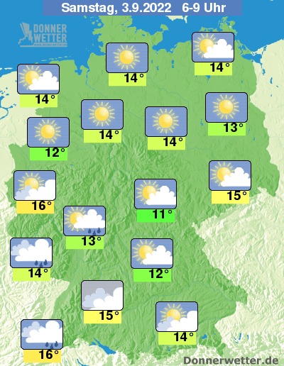 Die Temperaturen liegen in den Frühstunden bei Werten 11 Grad im Thüringer Becken und um 16 Grad im Rheinland.