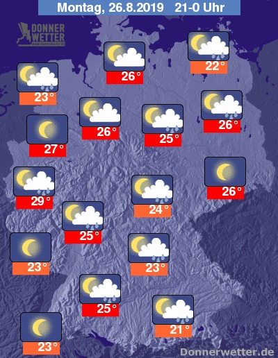 In den Abendstunden zeigt sich der Himmel über weiten Teilen des Landes heiter oder locker bewölkt und vor allem in der Südhälfte, aber auch entlang der Oder sowie am Niederrhein und den Küsten muss zeitweise mit Schauern und Gewittern gerechnet werden. Überwiegend sonnig und trocken bleibt es in den kommenden Stunden zwischen Weser und Elbe sowie am Oberrhein.