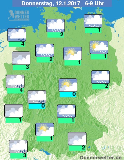 Der Donnerstag startet mit vielen Wolken und nur wenigen Sonnenstrahlen, die es ab und zu im Nordosten durch die Wolken schaffen. Im Nordosten Schneefall und Richtung Westen Schneeregen oder Regen möglich. Vor allem in der Nordhälfte und auf den Gipfeln der Mittelgebirge teils starke Sturmböen.