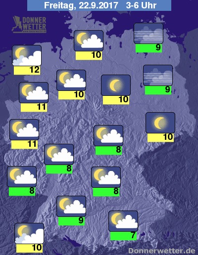 In der Nacht kühlt es dann bei meist klarem Himmel jedoch wieder deutlich ab. Bei etwas dichterer Bewölkung in Nordseenähe fallen die Temperaturen auf Werte um die 12 Grad, während es am Alpenrand noch etwa 5 Grad kälter wird. In Ostseenähe bildet sich in den Morgenstunden zudem lokal Nebel.