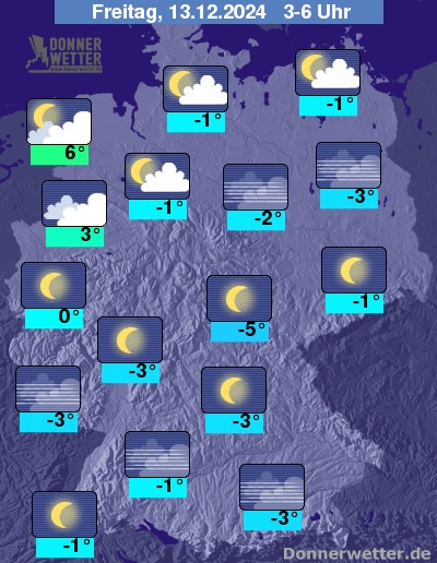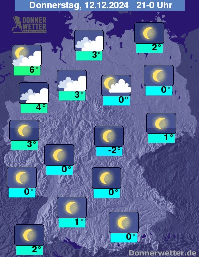In der Nacht zum Freitag bleibt der Himmel über dem Norden meist hochnebelartig bedeckt, vor allem im Süden und der Mitte kann sich im Nachtverlauf teils dichter Nebel oder Hochnebel bilden. In den Hochlagen der Mittelgebirge ist es teils auch sternenklar. Es bleibt meist niederschlagsfrei.