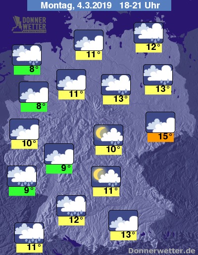 Am Abend nimmt das Schauerrisiko ein wenig ab, dennoch überwiegt ein bedeckter Himmel die Abendstunden. Die Temperaturen liegen bei 12 Grad C an der Ostseeküste und 11 Grad C im Schwarzwald.