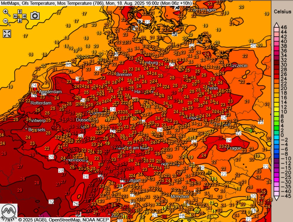 Lufttemperatur Montagnachmittag (16:00 Uhr) nach GFS