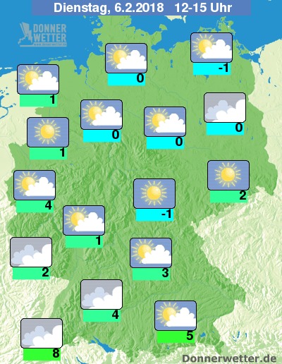 Heute Nachmittag zeigt sich das Wetter zum Großteil heiter oder sonnig. Dichte Wolken halten sich jedoch vor allem über dem Südwesten und auch über Berlin-Brandenburg, dabei bleibt es aber trocken. Die Temperatur liegt bei -1 Grad im Eichsfeld und etwa 8 Grad in Freiburg.