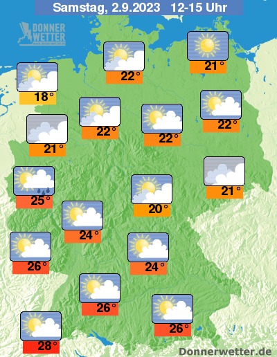 Heute Abend zeigt scih vor allem der Süden, aber auch in weiten Teilen der Norden heiter bis sonnig und trocken. Über die breiten Landesmitte von West nach Ost ziehen jedoch auch kompakte Wolken durch und es sind einzelne Schauer, selten auch Gewitter zu erwarten. Die Temperatur liegt bei 20 Grad in Wilhelmshaven und 28 Grad in Freiburg.