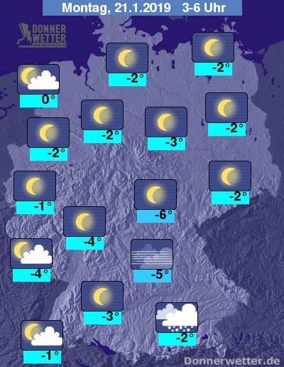 In der Nacht zum Montag zeigt sich der Himmel verbreitet sternenklar und es ziehen nur hier und da wenige Wolken durch. Direkt am Alpenrand ist es jedoch weiterhin stark bewölkt, dazu fällt hier gebietsweise auch Schnee, im übrigen Land bleibt es jedoch trocken. Die Temperatur sinkt auf 0 Grad an der Nordsee und bis -6 Grad im Thüringer Becken.
