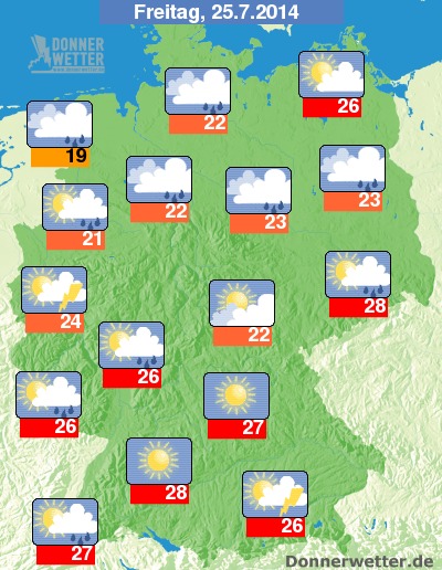 Am heutigen Freitag halten sich im Norden und Osten vielfach dichte Wolken aus denen zeitweise Regen fällt, auch im Westen ziehen häufig dichte Wolken durch und es bilden sich zeitweise Schauer und Gewitter. In den übrigen Landesteilen ist es meist nur locker oder aufgelockert bewölkt und es besteht nur ein leichtes Schauer- und Gewitterrisiko. Die Temperatur steigt auf 19 Grad in Emden und bis 28 Grad in Karlsruhe.
