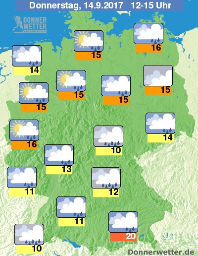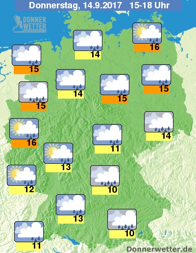 Am Nachmittag zeigt sich der Himmel meist dicht bewölkt oder bedeckt, einzelne Lichtblicke beschränken sich überwiegend auf die Nordwest-, später auf die Westhälfte. Mit Schauern muss verbreitet gerechnet werden, im Süden fällt regional auch ergiebiger Regen.