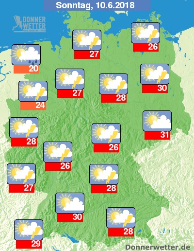 Am Sonntag ist es teils heiter, teils ziehen dichte Wolken auf, die vielerorts Schauer und zum Teil auch schwere Gewitter bringen können. Vor allem im Süden scheint dabei jedoch über lange Phasen die Sonne. Die Temperatur steigt auf eher kühle 20 Grad an der Nordsee, jedoch auf schwülheiße 31 Grad in der Lausitz.