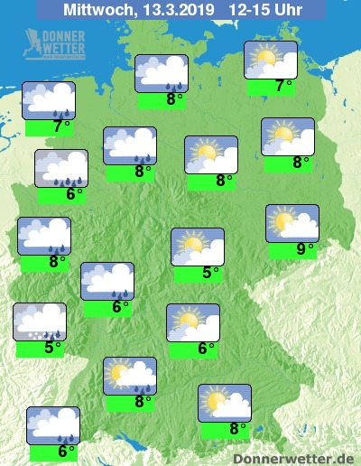 Im Laufe des Nachmittags kommen die Regen und Schauerwolken weiter nach Osten voran, örtlich drohen kurze Graupelgewitter. Auf den Bergen fällt zum Teil Schnee oder Schneeregen.