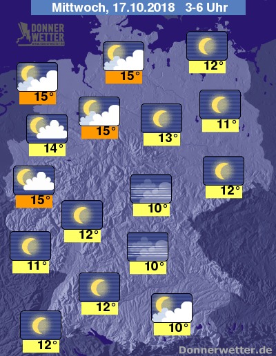 In der Nacht zeigt sich der Himmel in der Nordwesthälfte meist wechselnd oder stark bewölkt, entlang der Rheins überwiegen zunächst noch lockere Wolken. Im Nachtverlauf klart es hier dann aber auf, in den übrigen Landesteilen ist der Himmel abseits von örtlichen Nebelfeldern ebenfalls überwiegend sternenklar. Schauer sind in der Nacht nicht zu erwarten.