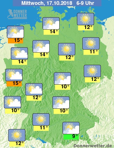 Die Temperaturen erreichen Werte um 15 Grad C im Emsland und um 10 Grad C am Alpenrand.