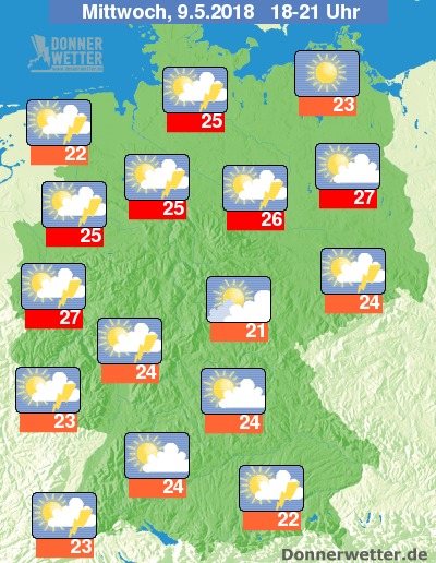Am Donnerstag zeigen sich im Osten und Nordosten häufig Aufheiterungen, im übrigen Bundesgebiet ist es zum Teil aufgelockert, teils ist es stark bewölkt, dabei bilden sich zeitweise Schauer, auch Gewitter sind möglich. Die Temperatur steigt nur noch auf 13 Grad am Pfälzer Wald und bis 26 Grad in der Lausitz.