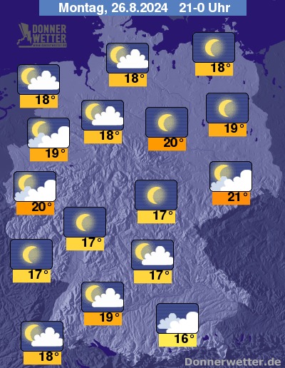 In der Nacht zum Dienstag lockern die Wolken über dem Nordwesten zunehmend auf. Auch in den übrigen Landesteilen ist es zumeist gering bewölkt oder sternenklar. Dichtere Bewölkung hält sich in der Nacht noch im südöstlichen Bayern, es bleibt aber meist trocken.