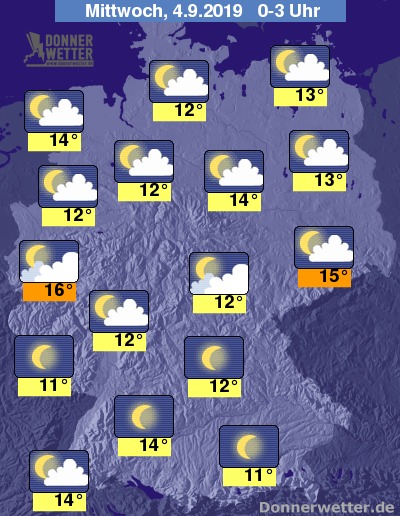 In den Nachtstunden zeigt sich der Himmel über weiten Landesteilen zunächst locker, im weiteren Verlauf auch regional stärker bewölkt; Schauer sind meist aber nicht zu erwarten. Südlich des Mains funkeln die Sternen dagegen von einem überwiegend wolkenlosen Himmel, an den Alpen kann sich zeitweise Nebel bilden.