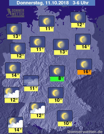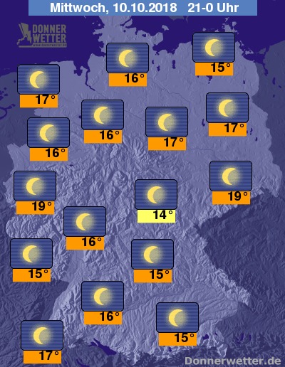 Die Dämmerungszeit geht in Deutschland meist wolkenlos oder nur gering bewölkt über die Bühne. Die untergehende Sonne verzaubert uns mit ihren "goldenden Oktoberstrahlen". Am frühen Abend bewegen sich die Temperaturen noch verbreitet im angenehm spätsommerlichen Bereich von 21 bis 25 Grad.