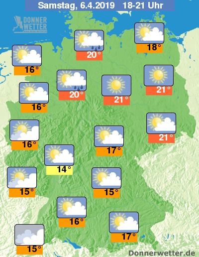 Heute Abend ist es über der Südwesthälfte teils heiter, teils können aber auch einige, selten auch dichte Wolken durchziehen. Über dem Norden und Osten ist es häufig heiter, dabei sind über dem Norden ganz vereinzelt auch Schauer oder Gewitter möglich, sonst bleibt es weitgehend trocken. Die Temperatur liegt bei 14 Grad im Taunus und bis 21 Grad in Dresden.
