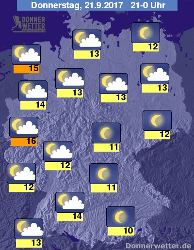 Die Temperaturen fallen hingegen bereits mit Einbruch der Dunkelheit merklich. Bis zum frühen Morgen werden in Nordseenähe Tiefstwerte um die 12 Grad erreicht, am Alpenrand fällt das Thermometer auf 7 Grad.