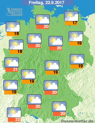 Der Freitag bringt dann erneut viel Sonne. Lediglich in Küstennahe werden die Wolken zwischenzeitlich etwas dichter. Dazu wird es noch rund einen Grad wärmer als am vorangegangenen Tag. An der Ostsee reicht dies für Höchstwerte um die 17 Grad, im äußersten Südwesten sind deutlich über 20 Grad möglich.