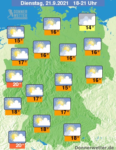 Heute Abend scheint über dem Süden und Westen weiterhin häufig die Sonne, dazwischen ziehen aber auch einige, meist jedoch lockere Wolken durch. Oft starke, teils aufgelockerte Bewölkung zieht über die Nordosthälfte des Landes hinweg, jedoch bleibt es auch hier trocken. Die Temperatur liegt bei 14 Grad in Rostock und 20 Grad in Freiburg.