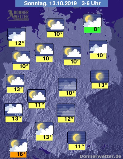 In der Nacht zum Sonntag ist es über der Nordwesthälfte der Republik stark, teils auch aufgelockert bewölkt, dazu kann vor allem im Nordseeumfeld und im Saarland etwas Regen fallen. Im übrigen Land ist es oft gering bewölkt oder sternenklar, gebietsweise aber auch wechselnd bewölkt, dazu bleibt es trocken. Die Temperatur sinkt auf 16 Grad in Freiburg und bis 8 Grad in Neubrandenburg.