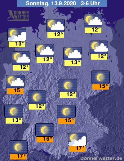 In der Nacht zum Sonntag zeigt sich der Himmel über der Südosthälfte Deutschlands weitgehend sternenklar. Weiter nach Norden und Westen hin ziehen allerdings oft auch einige, jedoch meist lockere Wolkenfelder durch. Es bleibt landesweit trocken bei Tiefstwerten von 17 Grad in München und bis 12 Grad in Hamburg.