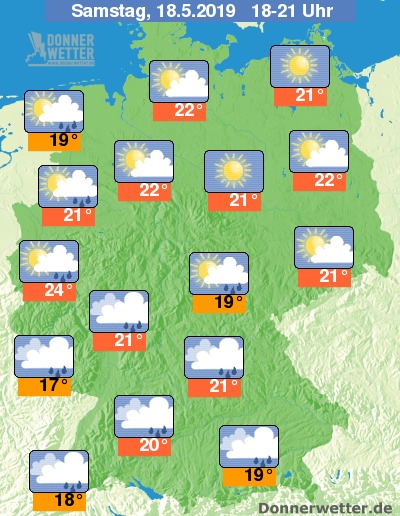 Heute Abend zeigt sich die Nordosthälfte Deutschlands weitgehend heiter bis sonnig und trocken, dagegen bringen dichte Wolken der Südwesthälfte des Landes zeitweise Schauer und lokal auch Gewitter. Die Temperatur liegt bei milden 17 bis 24 Grad.