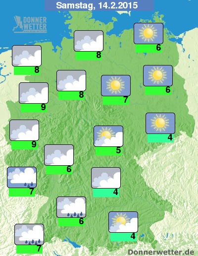 Heute bleibt es vom Nordosten über den Osten bis in den Südosten Deutschlands verbreitet sonnig und trocken. Westlich davon zieht dagegen meist starke Bewölkung durch, dabei fällt im Südwesten zeitweise etwas Regen, sonst bleibt es aber weitgehend trocken. Die Temperatur steigt auf 4 Grad entlang der Donau und bis 9 Grad in Köln.