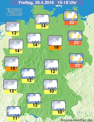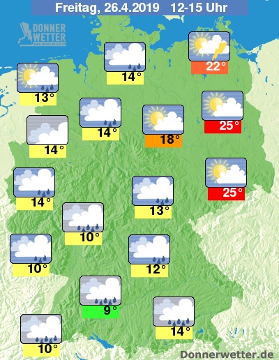Bis zum Abend nehmen Schauer und Gewitter auch im Nordosten und Osten zu. Sonst lässt der Regen von Westen her nachu und die Wolkendecke lichtet sich zum Teil.