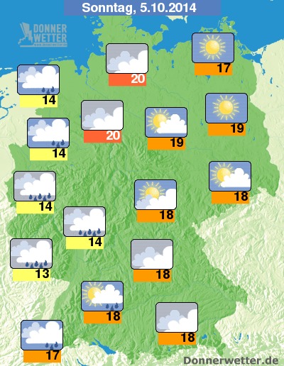Am Sonntag ist es nach Osten hin zunächst noch häufig freundlich und trocken, sonst ziehen von Westen her aber zunehmend dichte Wolken und es setzt Regen ein. Die Temperatur steigt auf 13 Grad am Pfälzer Wald und bis 20 Grad an der Elbe.