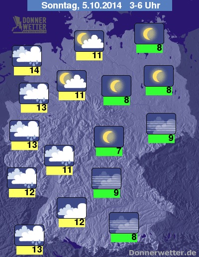 In der kommenden Nacht werden die Wolken nach Westen hin dichter und nachfolgend setzt dort auch zeitweise Regen ein, sonst bleibt es dagegen meist klar oder nur gering bewölkt und trocken. Stellenweise bildet sich Nebel oder Dunst.