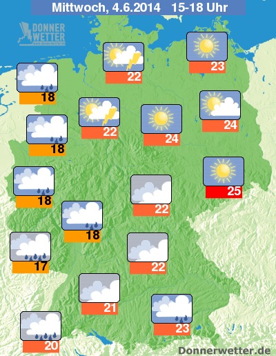 Am Nachmittag ist es in der Osthälfte noch meist heiter oder sonnig und trocken. In der Westhälfte bilden sich vielfach Schauer, gebietsweise auch Gewitter. Die Temperatur liegt anfangs noch bei 25 bis 17 Grad.