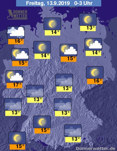 In der Nacht zeigt sich der Himmel über der Nordhälfte Deutschlands teils locker bewölkt, teils sternenklar. Dichtere Wolken halten sich vor allem an den Küsten, an der Nordseeküste sind zunächst auch noch einzelne Schauer möglich. In der Südhälfte funkeln in der Nacht vor allem über dem Schwarzwald die Sternen von einem meist wolkenlosen Himmel, sonst ist es wechselnd bewölkt oder es bildet sich Nebel.