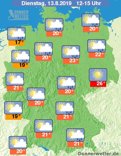 Die Temperaturen bewegen sich zwischen 17 Grad im Nordseeumfeld und 26 Grad in Teilen von Sachsen.