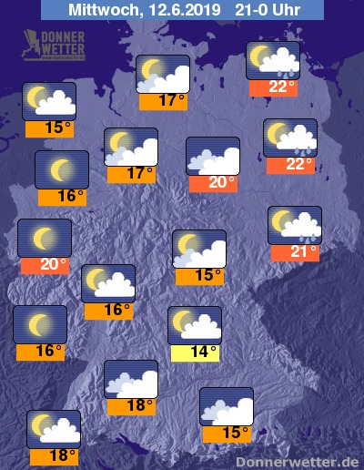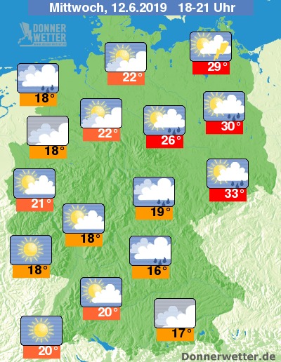Die Temperaturen liegen am frühen Abend allgemein zwischen 16 und 22 Grad, im Nordosten und Osten können teilweise noch schwüle 26 bis 33 Grad gemessen werden.
