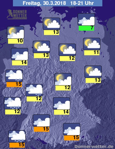 In der Nacht zum Samstag breiten sich die kompakten Regenwolken nordostwärts aus und erreichen bis zum Morgen auch den Norden und die Mitte des Landes, auch im Süden fällt unter dichten Wolken gebietsweise Regen. Trocken und dennoch meist stark bewölkt ist es im Osten und Nordosten. Die Temperatur sinkt auf 7 Grad in Bonn und etwa 0 Grad in Neubrandenburg.