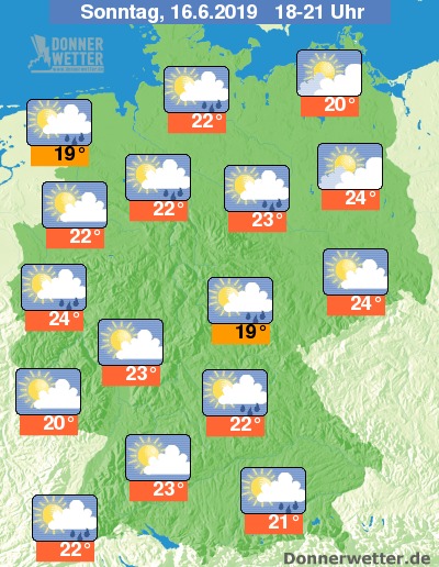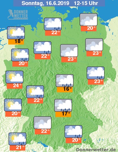 Heute Nachmittag ist es vor allem über der Westhälfte des Landes über weite Strecken heiter, im übrigen Bundesgebiet ist es teils stark, teils aufgelockert bewölkt, dabei bilden sich besonders im Süden gebietsweise Schauer und Gewitter, aber auch sonst sind einzelne Schauer und Gewitter möglich. Die Temperatur liegt bei 16 Grad am Thüringer Wald und bis 24 Grad in der Kölner Bucht.