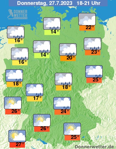 Heute Abend ist es südlich der Donau teils heiter, teils stärker bewölkt, aber weitgehend trocken. Nördlich davon ziehen dagegen dichte Wolken durch und es fällt verbreitet Regen. Die Temperatur liegt bei nasskalten 14 Grad in Hamburg und bis 27 Grad in Freiburg.