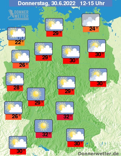 Heute Abend ist es noch oft heiter, jedoch ziehen zunehmend auch mehr Quellwolken auf und im Verlauf bilden sich vor allem im Süden und Westen vielerorts Schauer und lokale Gewitter, sonst ist das Schauer- und Gewitterrisiko eher gering. Die Temperatur liegt bei 23 Grad in Cuxhaven und 33 Grad in Nürnberg.