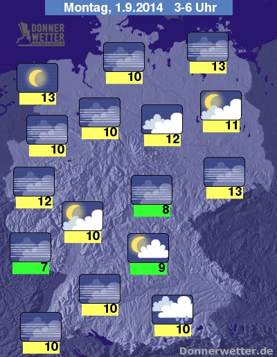 In der Nacht zum Montag klingen die zeitweiligen Schauer immer mehr ab, am längsten ist noch am Alpenrand und auch am Bayerischen Wald und an der Ostsee mit einzelnen Schauern zu rechnen, sonst lockert es dagegen häufig auf. Vor allem im Norden und Westen wird es häufig sternenklar, stellenweise kann sich jedoch Nebel bilden. Die Temperatur sinkt auf 13 Grad im Küstenumfeld und etwa 7 Grad am Pfälzer Wald.