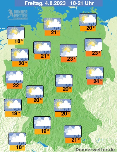 Heute Abend ist es anfangs noch aufgelockert bis stark bewölkt und es bilden sich noch einzelne Schauer. Die Niederschläge klingen jedoch im Abendverlauf mehr und mehr ab und vor allem im Norden und Westen heitert es vielerorts auf. Die Temperatur liegt bei 18 Grad an der Nordsee und bis 24 Grad an der Neiße.