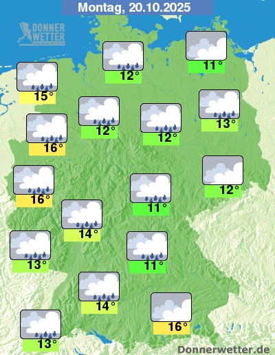 Am Montag bleibt es den Tag über weitgehend stark oder dicht bewölkt. Lediglich nach Osten hin bleibt es zunächst noch trocken, ansonsten zieht von Westen her kompakte Bewölkung mit zeitweiligen Regen auf. Die Temperatur erreicht 11 Grad im Vogtland und bis 16 Grad am Niederrhein.