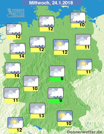 Am Mittwoch kann sich im Süden bei größtenteils nur lockerer bis aufgelockerter Bewölkung häufig die Sonne zeigen, dabei bleibt es trocken. Im Norden, teils auch über der Landesmite fällt dagegen bei dichten Wolken gebietsweise Regen oder Sprühregen, sonst ist es meist stark und nur teils auch aufgelockert bewölkt, jedoch weitgehend trocken. Es werden milde 9 bis 14 Grad erreicht.