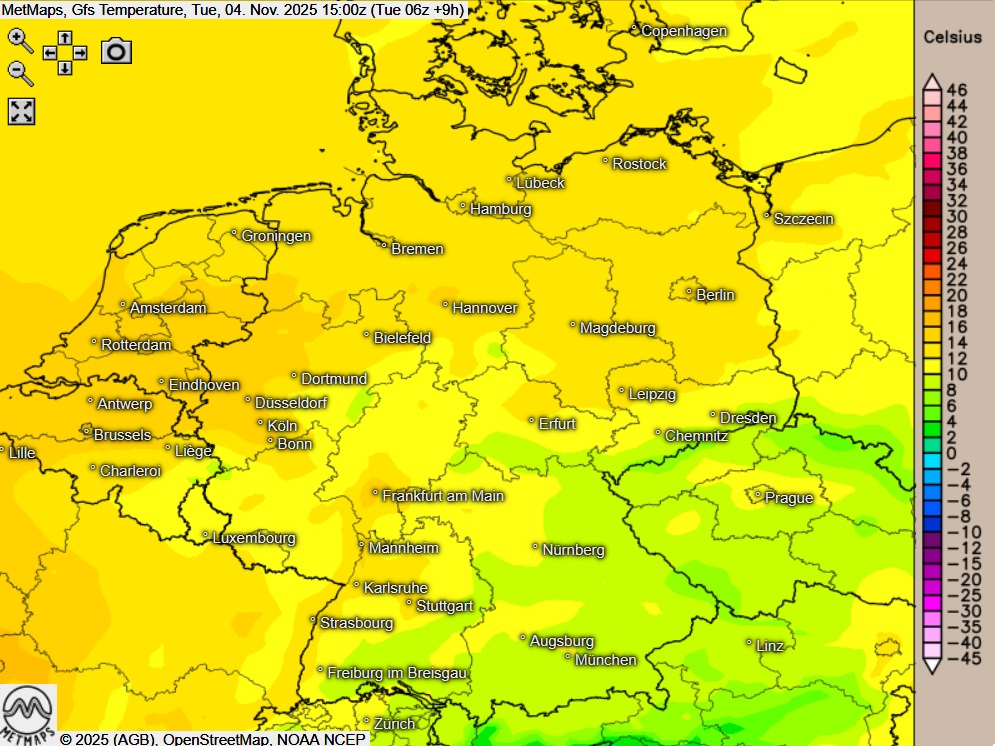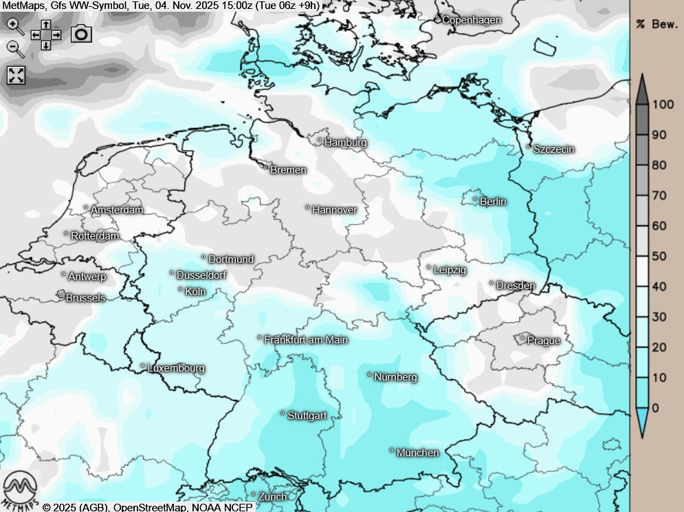 Am Dienstagnachmittag zeigt sich der Himmel über dem Norden des Landes bewölkt. In den übrigen Landesteilen überwiegt in den Nachmittagsstunden heiteres Novemberwetter oder es ist sonnig. Es bleibt trocken.