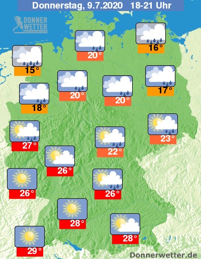 Am frühen Abend liegen die Temperaturen im Norden nur zwischen 15 und 21 Grad, in der Mitte zwischen 22 und 27 Grad und ganz im Süden und Südwesten zwischen 27 und 31 Grad.