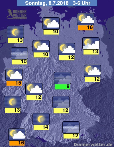 In der Nacht zum Sonntag ist der Himmel locker bewölkt oder sternenklar, dazu bleibt es trocken. Die Temperatur sinkt auf 16 Grad im Breisgau und bis 9 Grad im Eichsfeld.