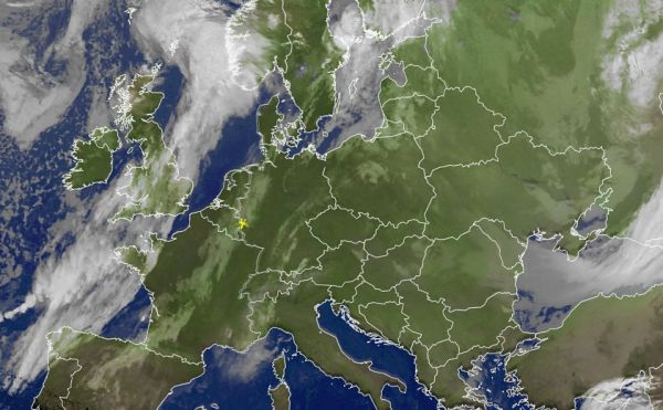 Auf dem aktuellen Satellitenbild ist eine erste Wetterfront über Deutschland zu sehen. Wolkenfelder ziehen durch. Die Hauptfront über dem Kanal erreicht den Westen am Montag.