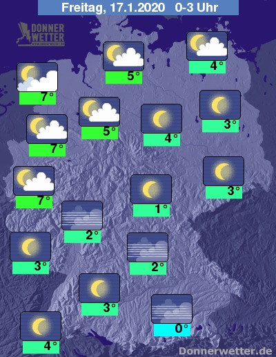 In der Nacht bleibt der Himmel über weiten Teilen der Nord- und Westhälfte locker oder aufgelockert bewölkt - mit Tiefstwerten um 8 bis 5 Grad werden die kommenden Stunden hier dementsprechend mild. Im Süden und Osten ist es überwiegend sternenklar, an Main und Donau kann sich gebietsweise auch Nebel bilden. Die Temperaturen sinken im Süden und Osten auf Tiefstwerte um 4 bis -1 Grad.