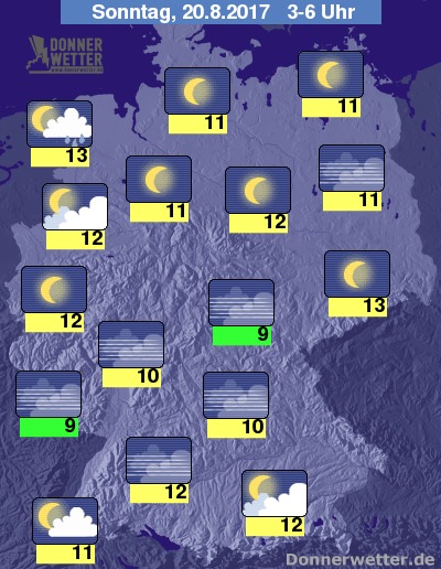 In der kommenden Nacht sind in Nordseenähe noch einzelne Schauer möglich, im übrigen Bundesgebiet zeigt sich der Himmel über der Republik aber überwiegend sternenklar und sonst locker bewölkt, dabei bleibt es trocken. Die Temperatur sinkt auf Werte zwischen 14 Grad in Emden und bis etwa 9 Grad im Thüringer Becken.
